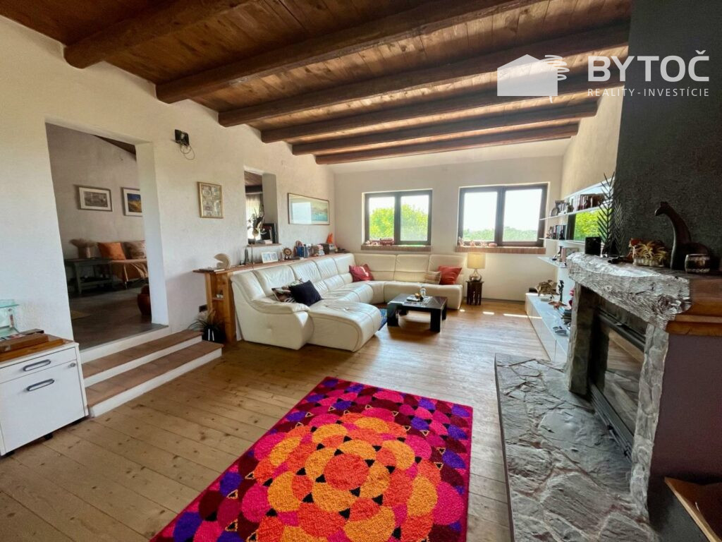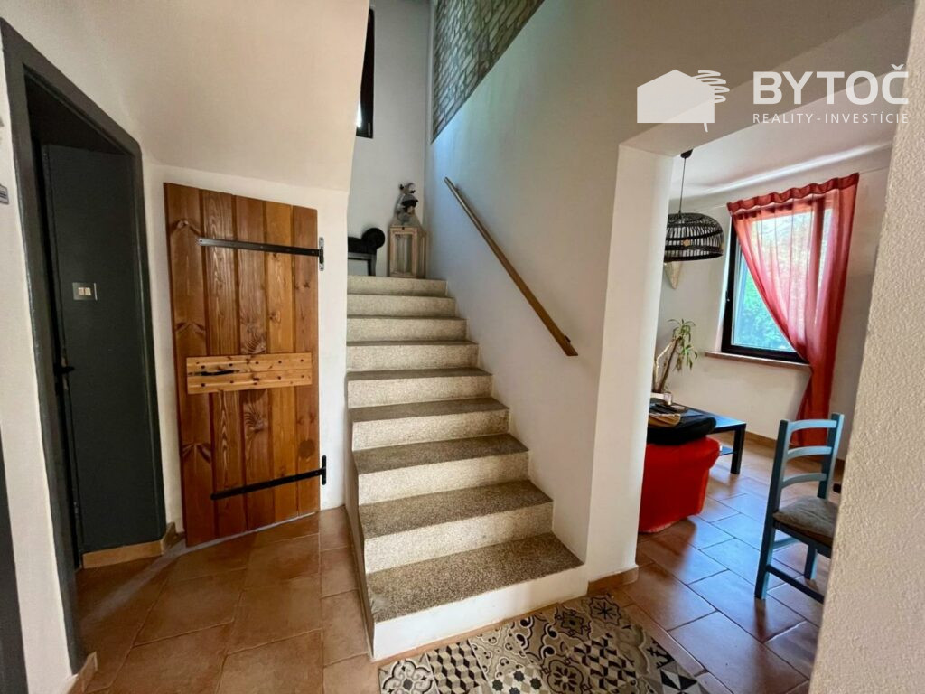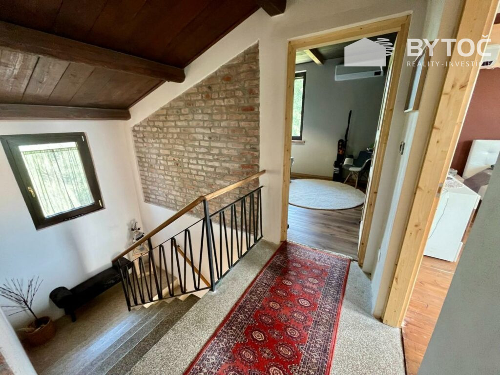 Prvé poschodie pozostáva z chodby, dvoch dvojlôžkových spální, pracovne alebo tretej spálne s prístupom na veľkú panoramatickú terasu s výhľadom na okolitú krajinu, kúpeľne a veľkej miestnosti, ktorá sa momentálne využíva ako obývacia izba, s krásnym krbom na drevo pre skutočne relaxačné večery. Vonkajšia veranda s výhľadom do záhrady ponúka ideálne miesto na obedy a večere pod holým nebom.