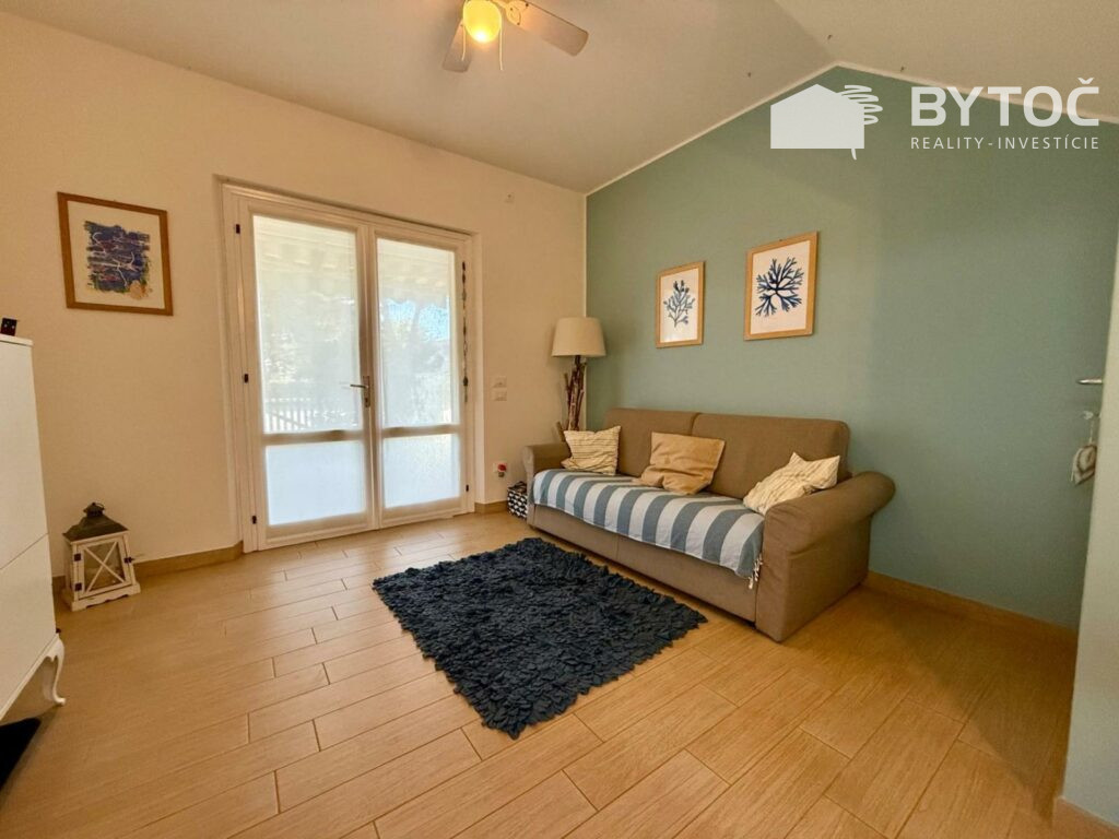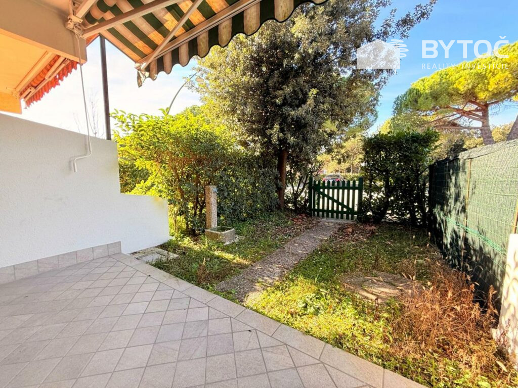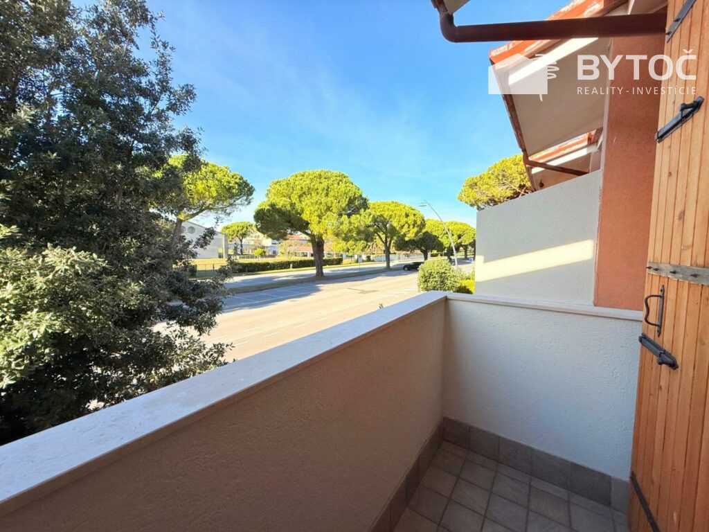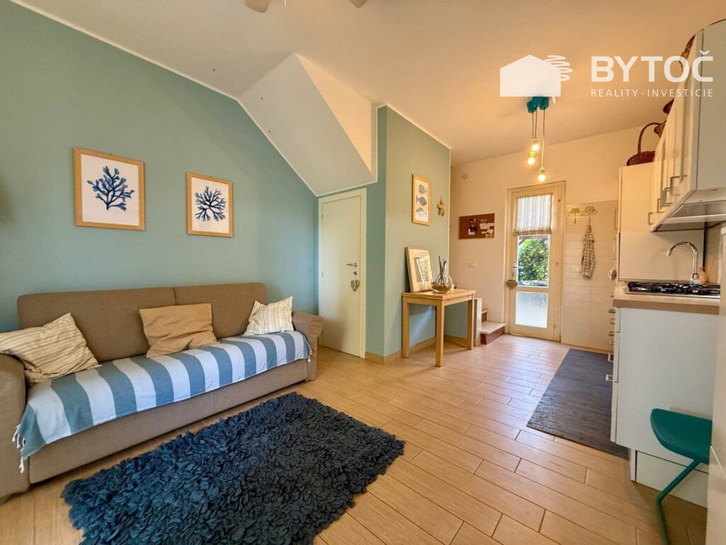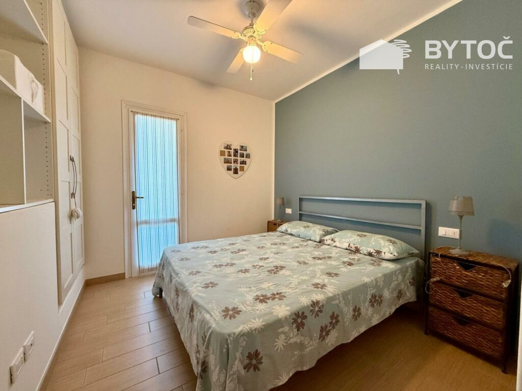 Na prízemí sa nachádza obývacia miestnosť s oddeleným kuchynským kútom, prístupom na veľkú krytú terasu s altánkom a taktiež vstupom do súkromnej predzáhradky s ďalšou krytou terasou s markízou. Na prvom poschodí sa okrem kúpeľne s oknom nachádzajú dve spálne (jedna s manželskou posteľou) obe s výstuom na vlastný balkón (resp. malú terasu). Výmera 75m2 (+ terasy a pozemok) Parkovanie priamo pred budovou. Vdialenosť od pláže Bibione Spiaggia cca 1000 metrov (cca 12 min pešo). Cena: 218.000 € (+ poplatky).