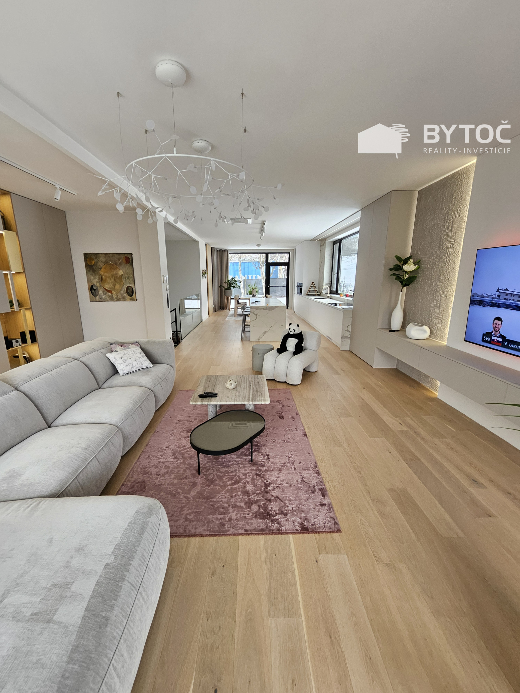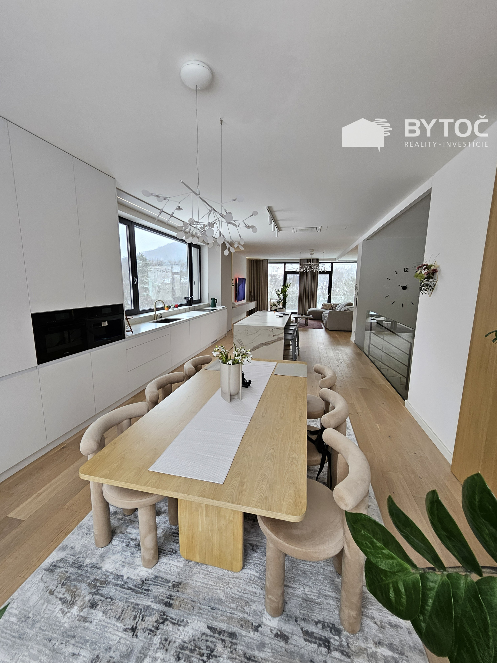 Interiér je vyhotovený v nadštandardnom prevedení s dôrazom na kvalitu použitých materiálov. Kuchyňa je vybavená vstavanými spotrebičmi značky Miele. Samozrejmosťou je klimatizácia,, domaci vrátnik, exteriérové screenove rolety,TV a wifi pripojenie / opticky kabel /. Nehnuteľnosť je pripravená na okamžité komfortné bývanie bez ďalších investícií. byt sa predava s jestvujúcim zariadenim okrem osobných veci. Mesačné naklady na energie, vodu, smeti a pod. cca 200,-€ V obyvačke je situovaná príprava na krb.