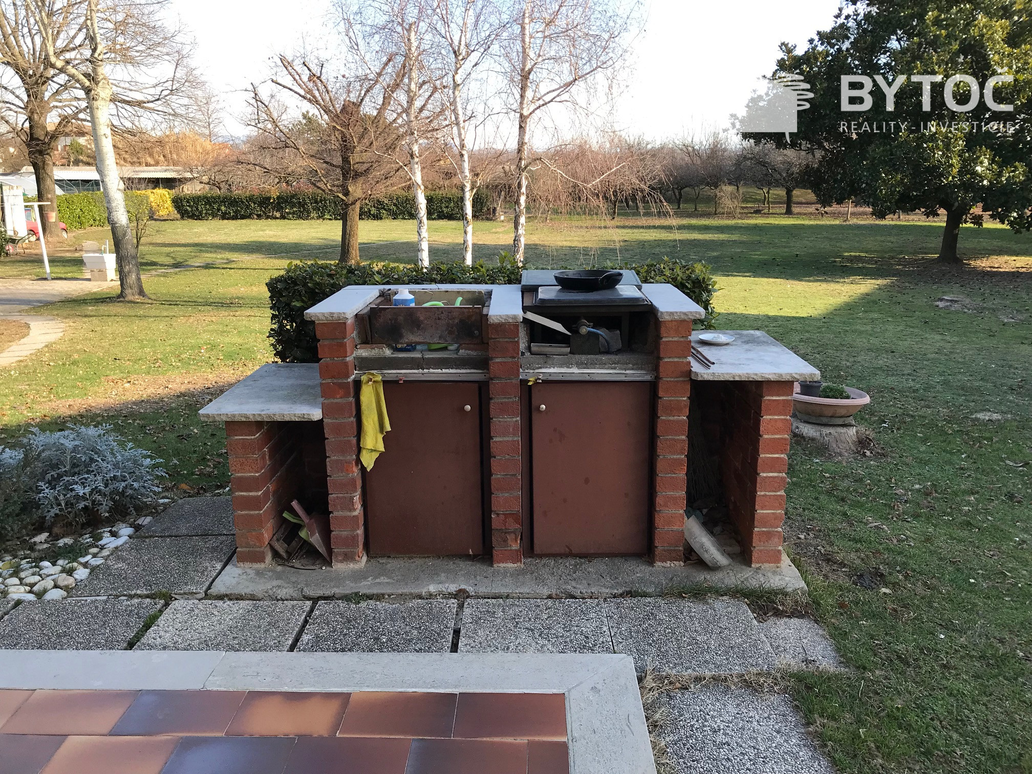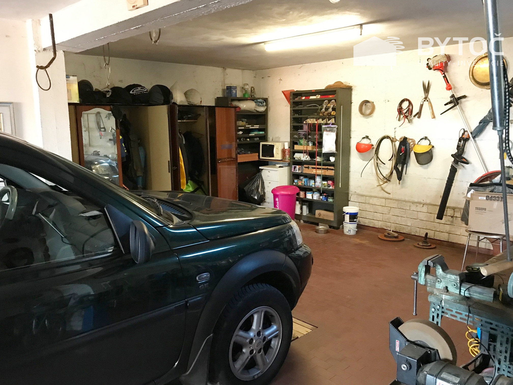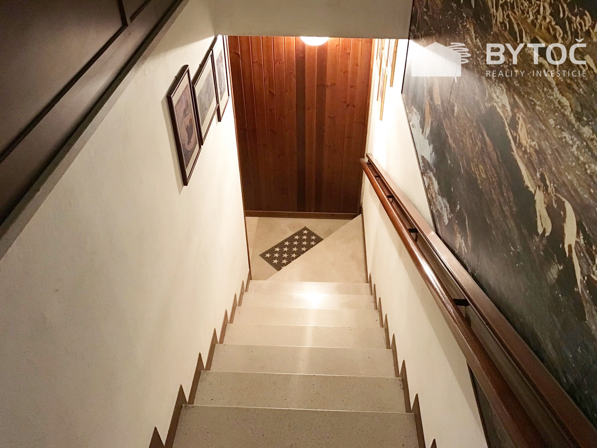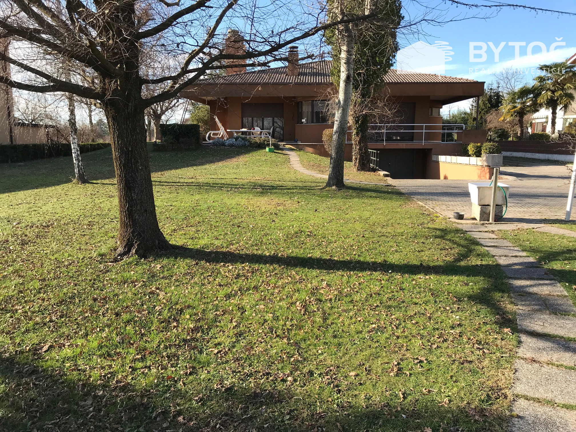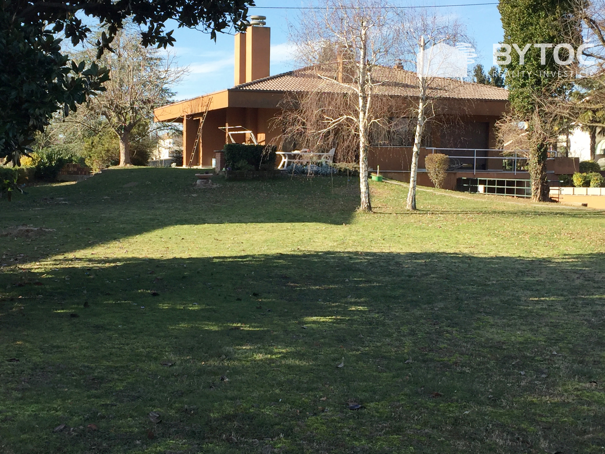 Vnútorné schodisko vedie do suterénu, kde sa nachádza veľká garáž (pre 2-3 autá), pivnica, technické miestnosti, kúpeľňa a zariadená spoločenská miestnosť. Oplotená záhrada s rozlohou 4 500 m2, upravená trávnikom a ovocným sadom.